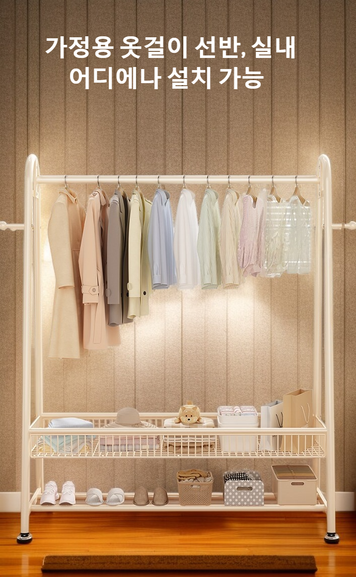공간을 효율적으로 사용하는 가정용 수납 옷걸이. 튼튼한 소재로 내구성 우수, 다양한 옷 정리 가능. 설치와 사용이 간편함.